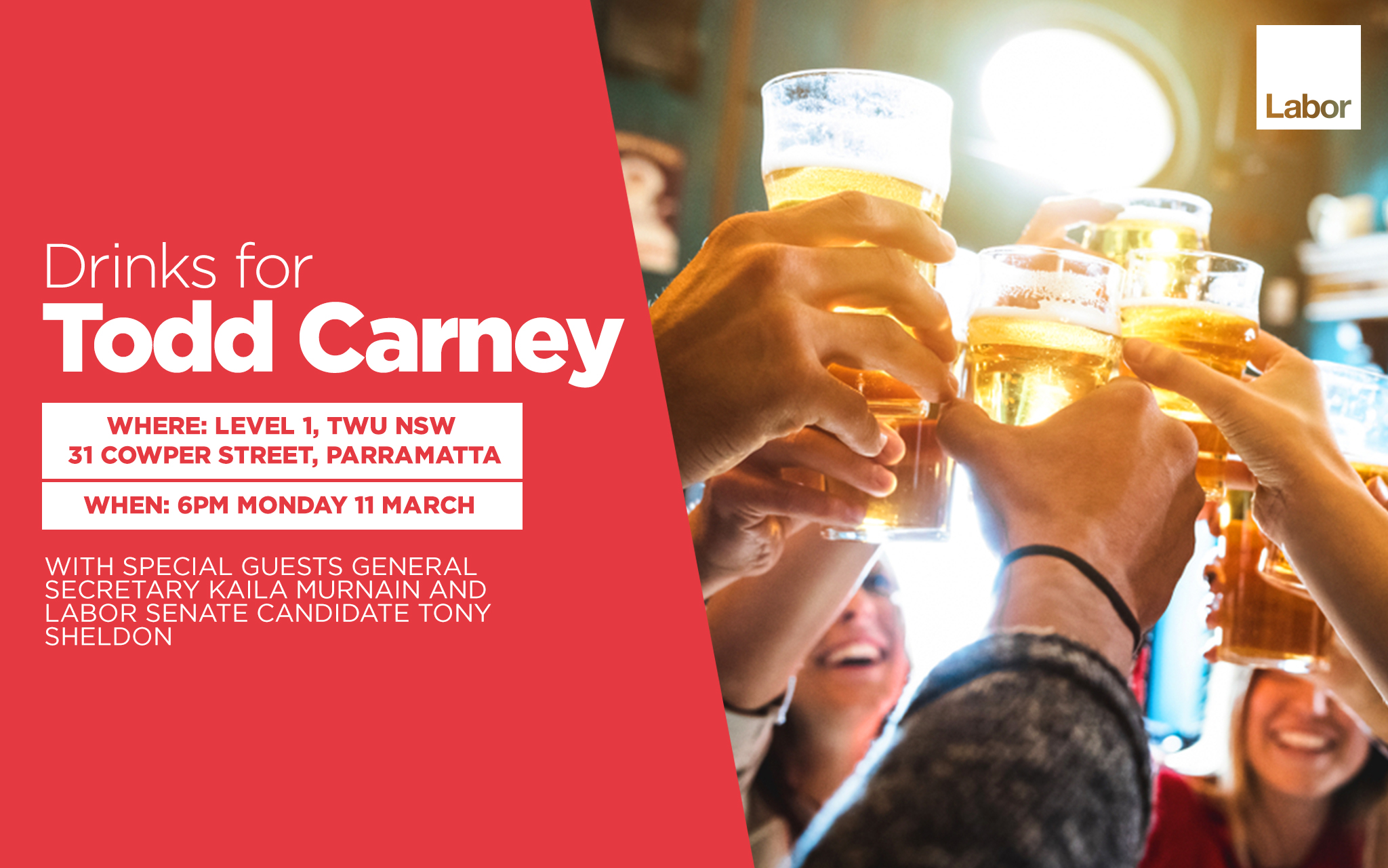 Join us for Drinks for Todd Carney, Labor Candidate for Mulgoa with guest speakers Kaila Murnain, NSW General Secretary and Tony Sheldon, Federal Labor Senate Candidate.
