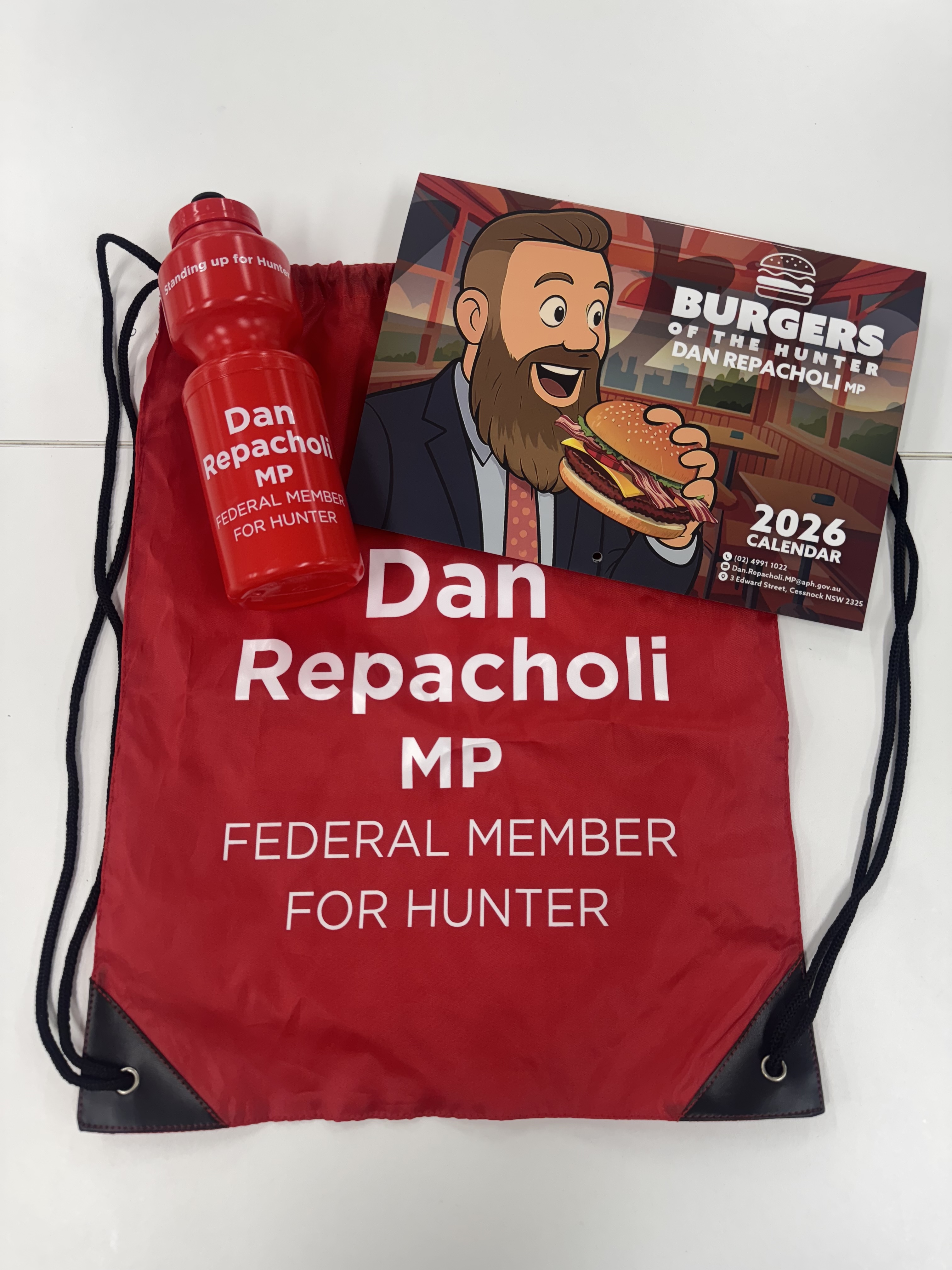 Third Prize:Dan Repacholi prize pack - including bag, water bottle and signed 2026 burger calendar.