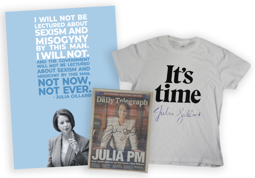 Included in this raffle is a Framed Misogyny Speech poster signed by former Prime Minister Julia Gillard, a signed It’s Time T-Shirt and a signed copy of the historic JULIA PM Daily Telegraph cover.